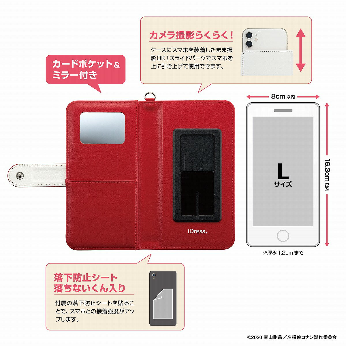 ●名探偵コナンのマルチカバー● 毎回映画書下ろしの限定生産 映画「名探偵コナン 緋色の弾丸」のスマホカバーが今回も登場!! 2020年劇場版[緋色の弾丸]ポスター柄のマルチスマホケースが登場! 内側もタイトルにちなんだ緋色カラー仕様! 便利なポケット収納&ミラー付き♪